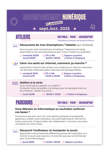 À travers cinq ateliers pratiques et progressifs, vous apprendrez à mieux connaître votre ordinateur, à maîtriser les outils essentiels et à naviguer sur Internet en toute autonomie. Chaque atelier peut être suivi indépendamment des autres : vous pouvez vous inscrire à un ou plusieurs ateliers selon vos besoins et votre niveau.